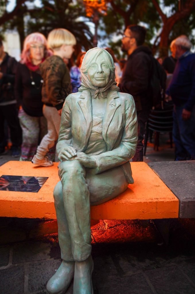 La escultura conmemorativa recrea a Sonia Torres a escala real, sentada con sus piernas cruzadas en un banco frente a la sede de Abuelas, allí donde ella salía a respirar, a descansar un poco, con sus ojos en búsqueda.