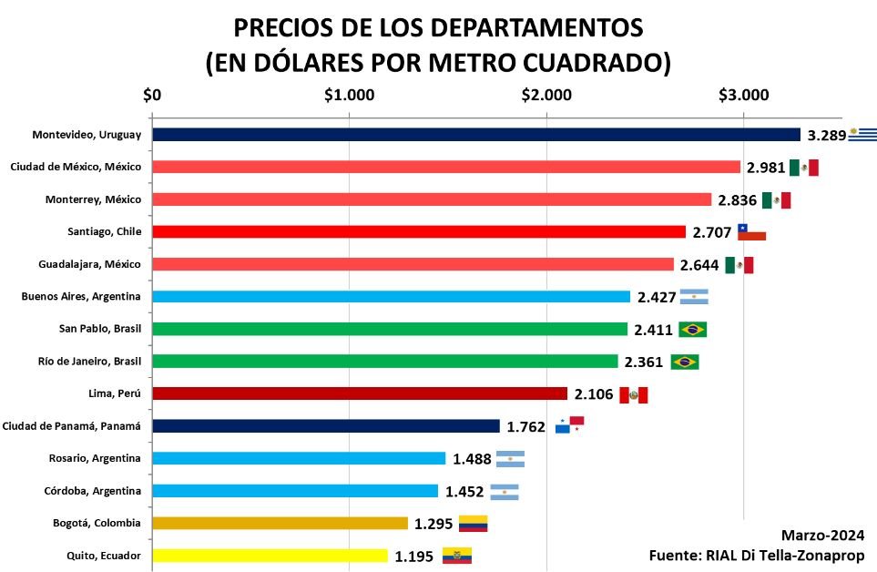 El Centro de Investigación en Finanzas (CIF) de la Escuela de Negocios de la Universidad Torcuato Di Tella en conjunto con Zonaprop presentan los resultados del Relevamiento Inmobiliario de América Latina (RIAL Di Tella – Zonaprop) de marzo de 2024. Las ciudades con el metro cuadrado más caro de la región son Montevideo (3.289 dólares), Ciudad de México (2.981 dólares), Monterrey (2.836 dólares) y Santiago de Chile (2.707 dólares).