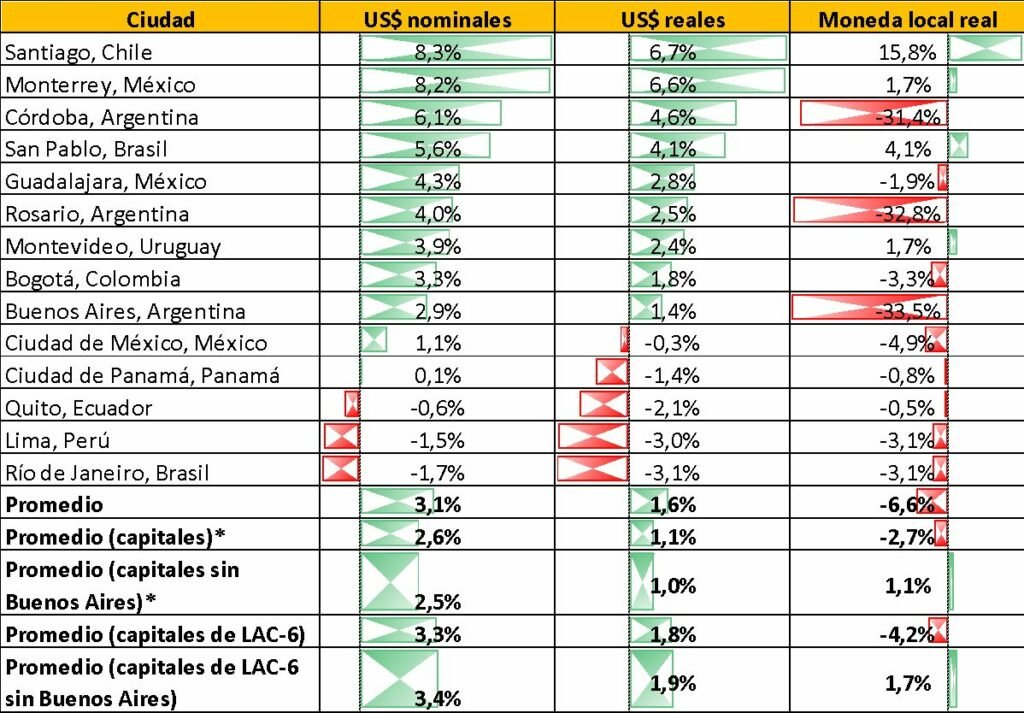 Medido en dólares nominales, la ciudad en la que hubo un mayor aumento porcentual del precio fue Santiago de Chile (8,3%). Por su parte, las mayores caídas se dieron en Río de Janeiro (-1,7%), Lima (-1,5%) y Quito (-0,6%) en el último semestre. Valuado en moneda local real, las ciudades con mayores incrementos son Santiago (15,8%) y San Pablo (4,1%). Por el contrario, las mayores caídas fueron en Buenos Aires (-33,5%), Rosario (-32,8%) y Córdoba (-31,4%).