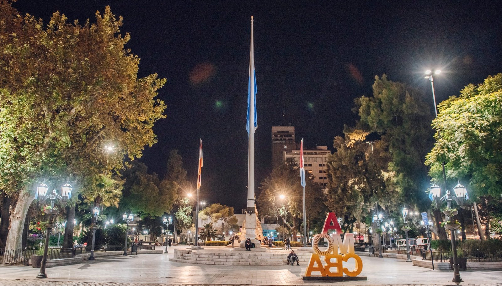 La estatua del Libertador San Martín y el mástil con la bandera Argentina resaltan en el espacio: se instalaron cuatro columnas de 12 metros que las iluminan con proyectores de haz concentrado.