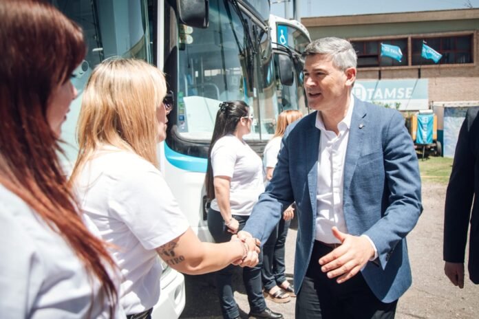 El intendente de la ciudad de Córdoba, Daniel Passerini, junto al secretario a cargo de la cartera de Movilidad Urbana, Rodrigo Fernández, presentaron los flamantes colectivos con combustión a GNC que comenzarán a prestar servicio desde este martes en las líneas A1, B1 y C1 correspondientes a la empresa TAMSE.