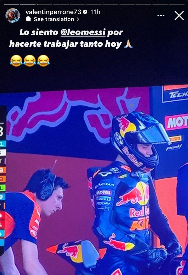 Antes de salir a pista, la transmisión oficial lo captó junto a un mecánico muy parecido a Leo Messi. En consecuencia, el motociclista subió una historia a su Instagram y escribió: «Lo siento, Leo Messi, por hacerte trabajar tanto hoy», acompañado de emojis de risa.