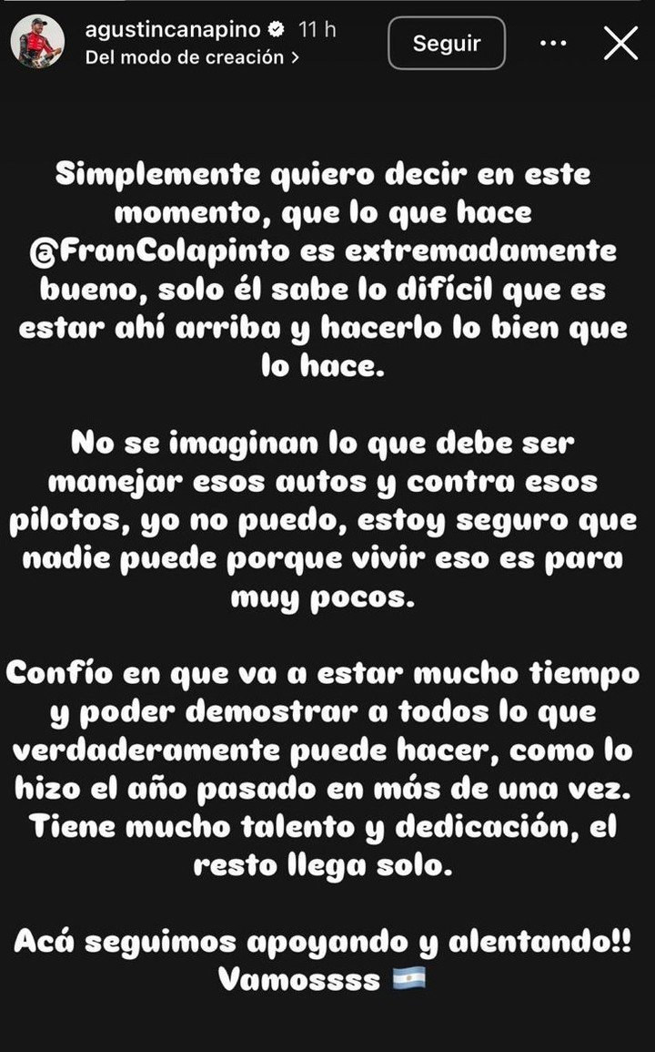 Se trata de Agustín Canapino, deportista que conquistó 15 títulos en distintas categorías y recientemente tuvo un breve paso por la IndyCar. «Simplemente quiero decir en este momento que lo que hace es extremadamente bueno«, lanzó en su cuenta de Instagram.
