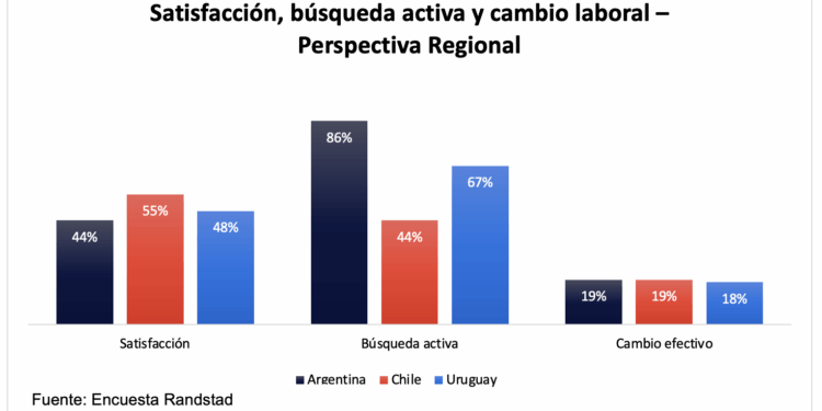 Si comparamos estos datos con los de la región, Argentina encabeza el podio, con un 86% de trabajadores en búsqueda activa de trabajo. Luego se ubica Uruguay con el 67% y, finalmente, Chile con el 44%, es el país con menor deseo de cambio laboral.