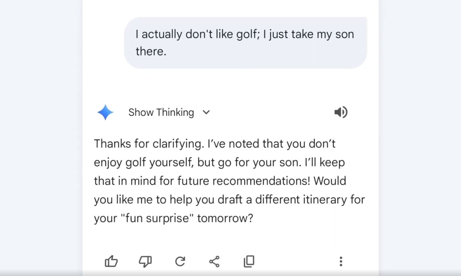 Reasoning: You tell the model, “I don’t usually eat steak,” but it suggests a steakhouse recommendation again a week later even though you generally don’t prefer steak.