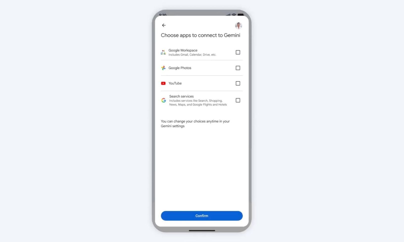 Este avatar del asistente de IA sabe lo que hay en tu bandeja de entrada. Y fotos. Y el historial de búsquedas. Y ver discos en YouTube. Básicamente, todos los productos clave de Google que definen tu vida digital. ¿Para qué? Bueno, simplemente sabe estas cosas — si se lo permites. Y una vez que le hayas dado permiso, las respuestas de Gémini serán personalizadas para ti.