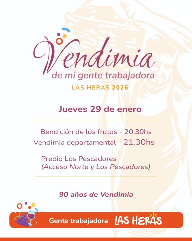 La fiesta departamental de la Vendimia 2026 en Las Heras (Mendoza) será este jueves 29, cuando la Bendición de los Frutos inicie la ceremonia en el predio Los Pescadores.