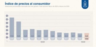 La inflación de febrero fue del 2,4% y acumuló un 66,9%...