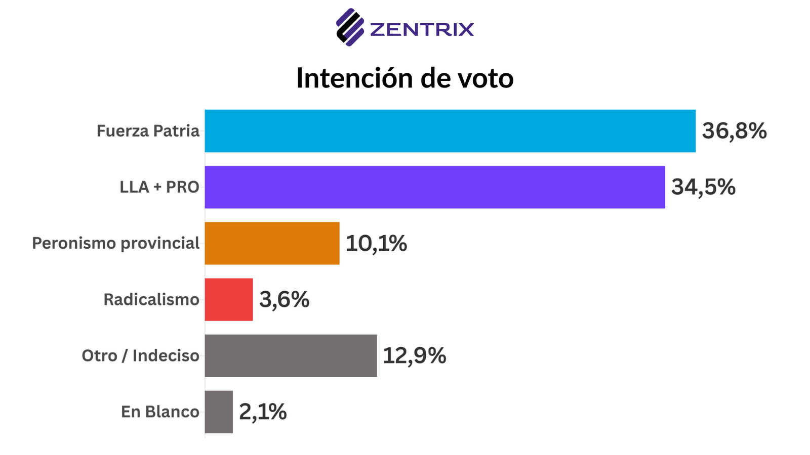 De cara a las legislativas de octubre, el sondeo refleja un escenario de paridad competitiva entre Fuerza Patria (36,8%) y la coalición La Libertad Avanza + PRO (34,5%). El peronismo provincial se ubica como tercera fuerza con 10,1%, mientras que el radicalismo queda relegado con apenas 3,6%.